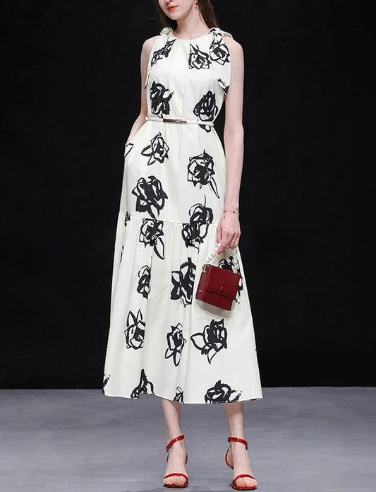 White Floral Print Sleeveless Vintage Style Maxi Dress