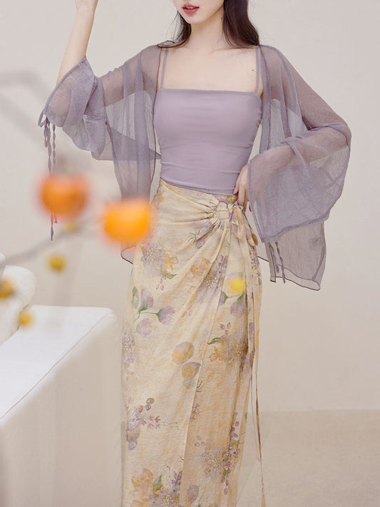 3PS Purple Floral Tube Top and Slit Skirt 1950s Cardigan Suit