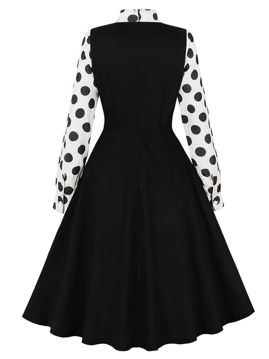 Black And White Polka Dots Bow Collar 1950s Vintage Swing Dress