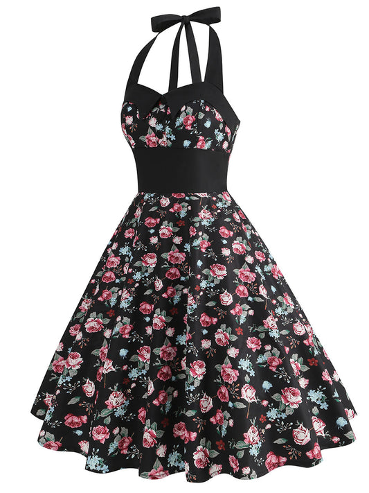 Black Rose Sweet Heart Halter Sleeveless 1950S Vintage Dress