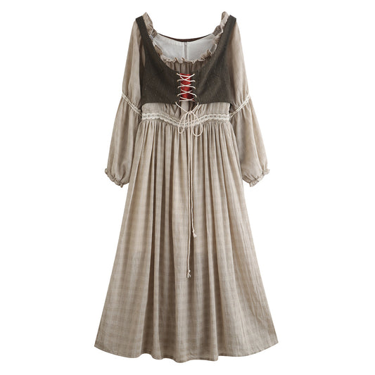2PS Grey Off Shoulder Cottagecore Dress with Green Vest