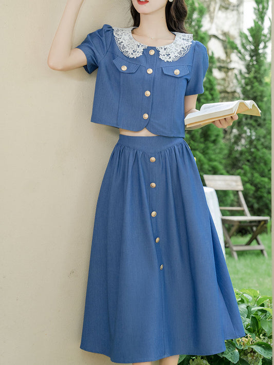 2PS Blue Lace Peter Pan Collar Short Sleeve Shirt With Skirt Suits
