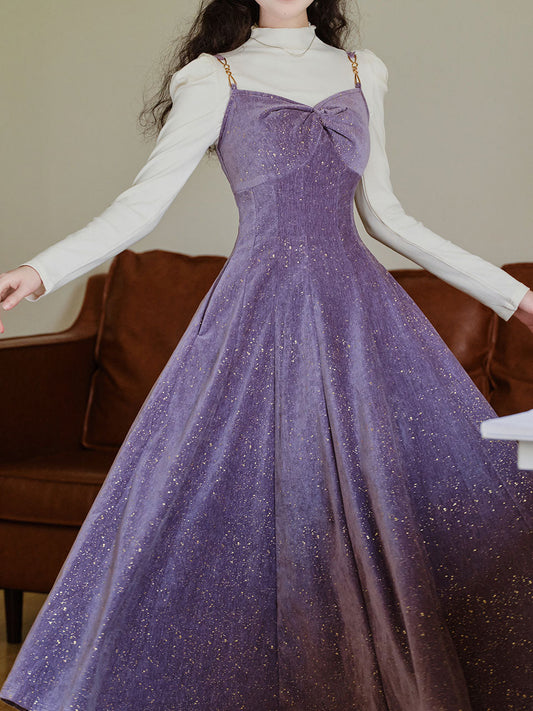 2 Piece Sequin Slip Dress in Purple With White Sweater Set
