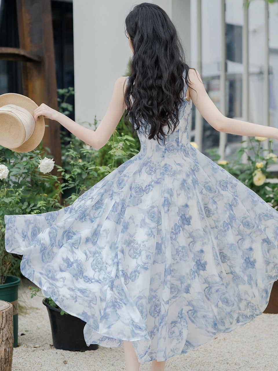 2PS Blue Rose Spaghetti Strap 1950S Vintage Dress With Long Sleeve Cardigan