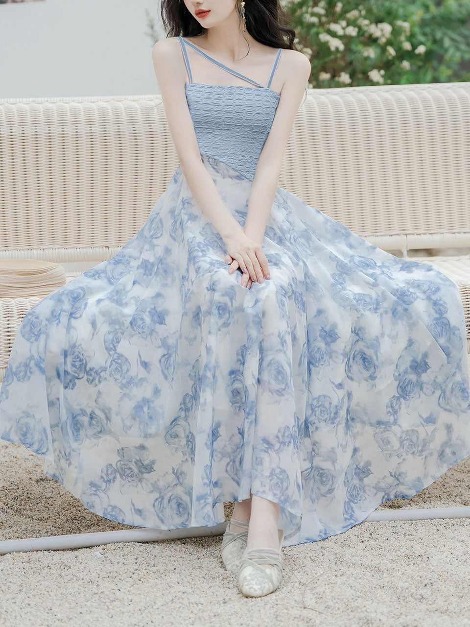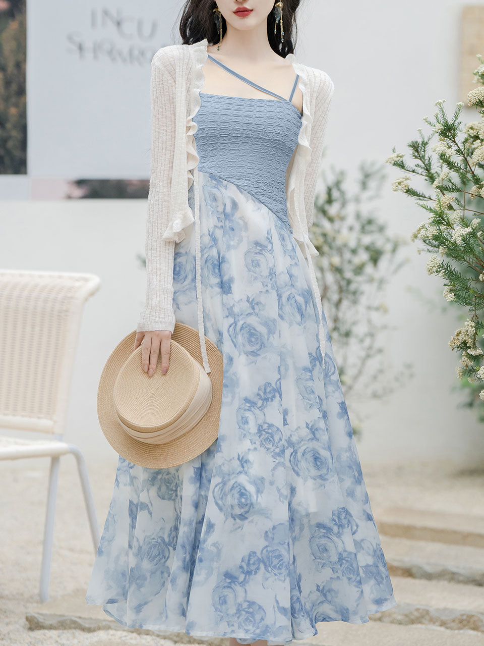 2PS Blue Rose Spaghetti Strap 1950S Vintage Dress With Long Sleeve Ruffles Cardigan