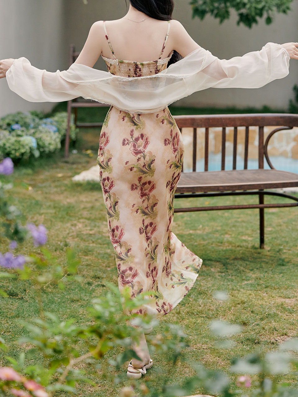 2PS Brown Spaghetti Strap Tropical Pattern Holiday Dress With White Long Sleeve Cardigan