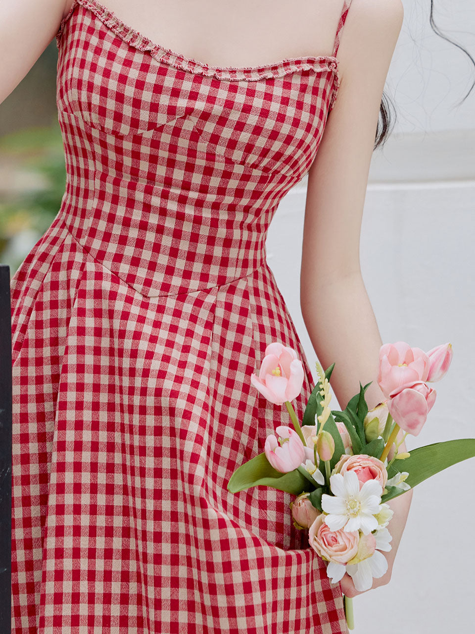 2PS Red Plaid Spaghetti Strap Dress With White Shawl Dress Suit