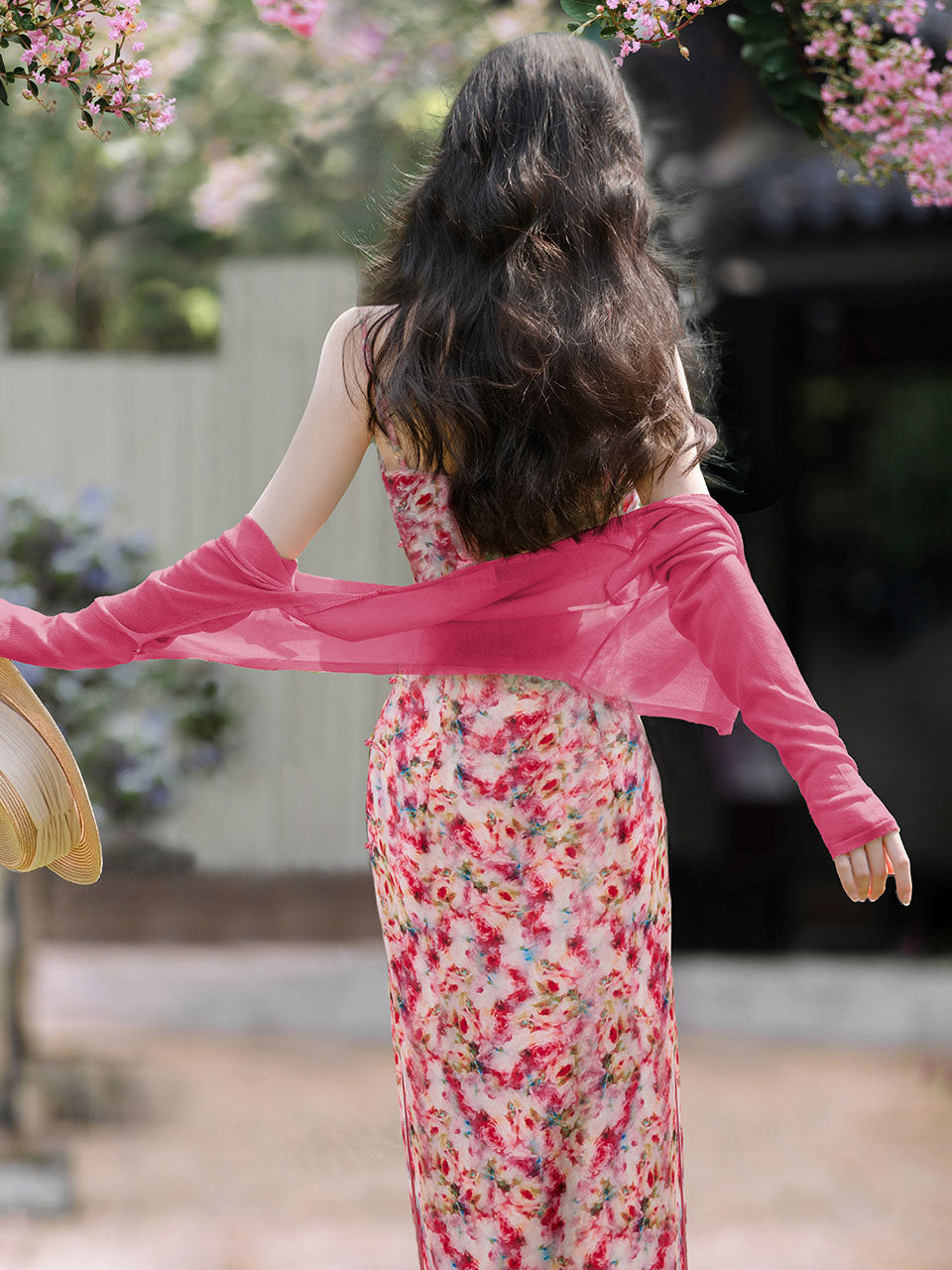 2PS Rose Floral Print Spaghetti Strap 1950S Vintage Dress With Pink Long Sleeve Cardigan