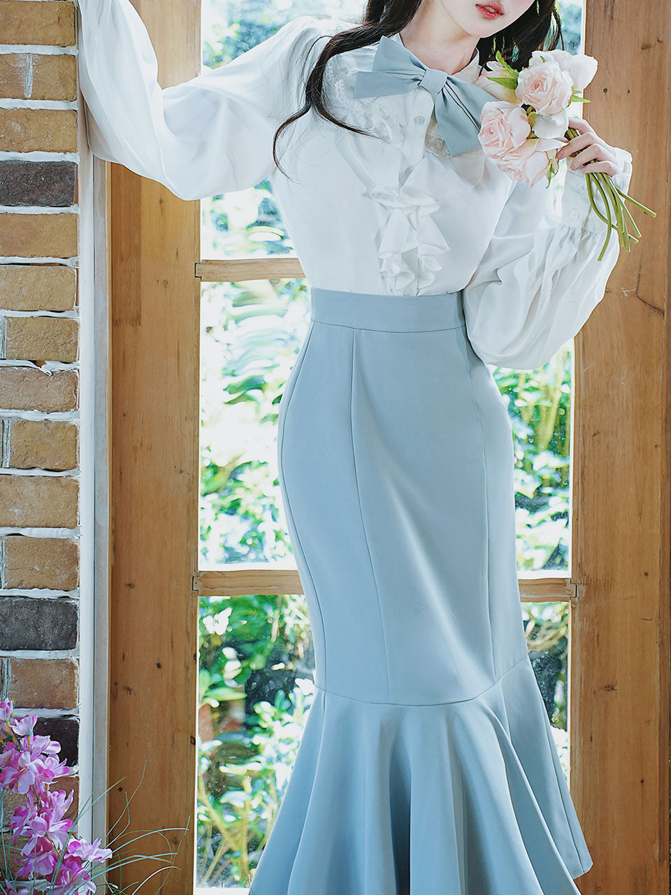 2PS White Lace Bow Long Sleeve Shirt And Blue Fishtail Skirt Outfits