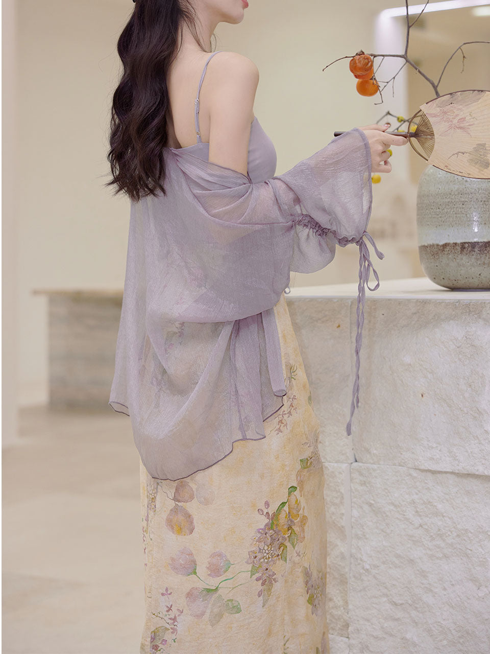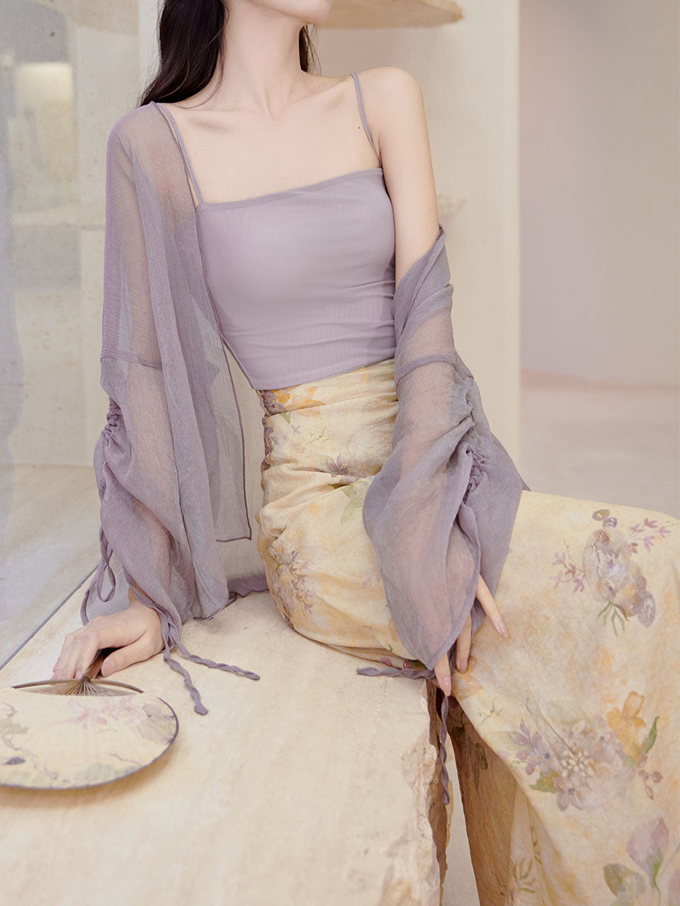 3PS Purple Floral Tube Top and Slit Skirt 1950s Cardigan Suit
