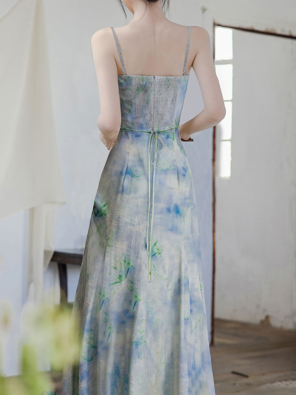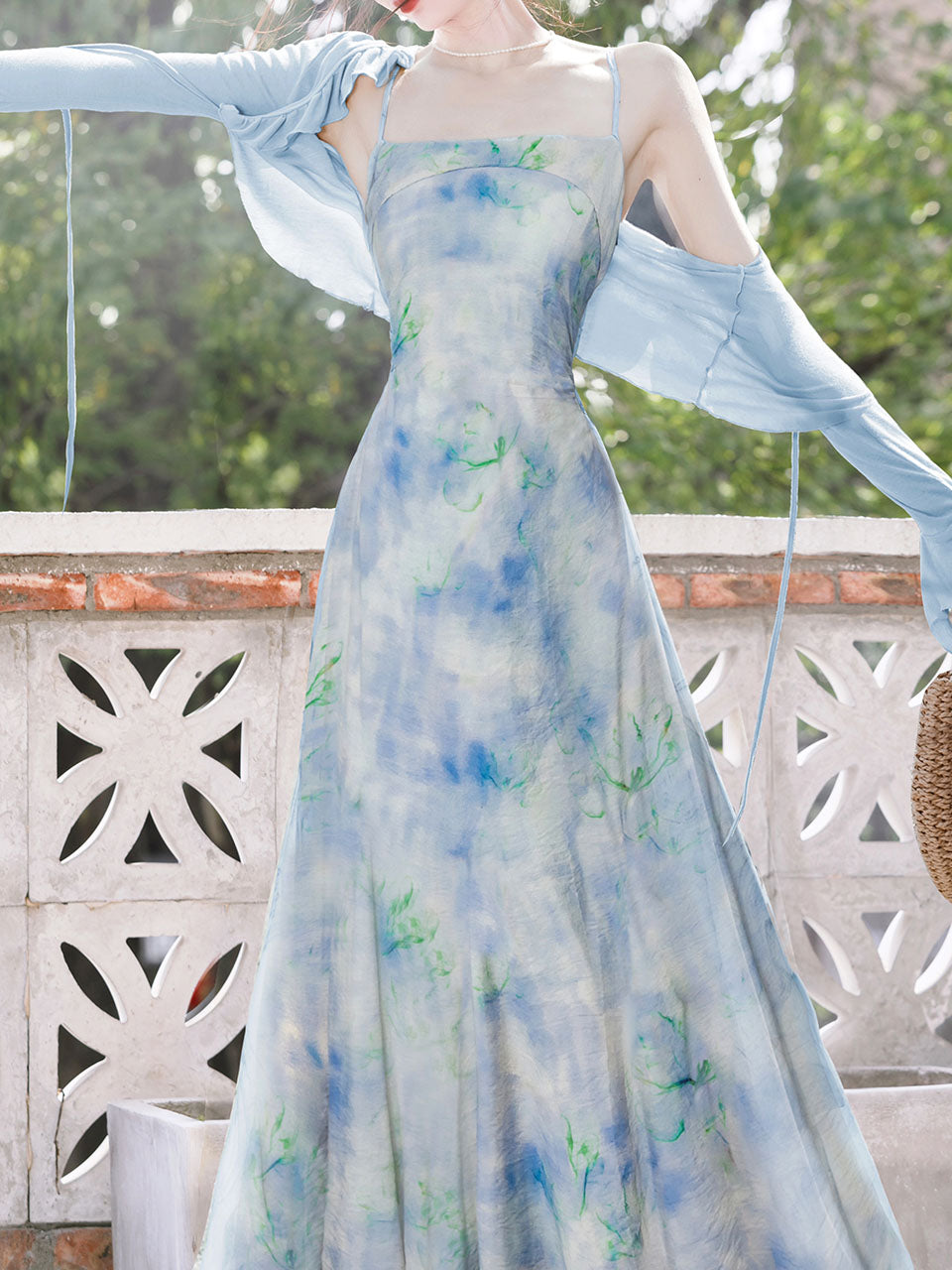 2PS Blue Floral Print Spaghetti Strap 1950S Vintage Dress With Long Sleeve Cardigan